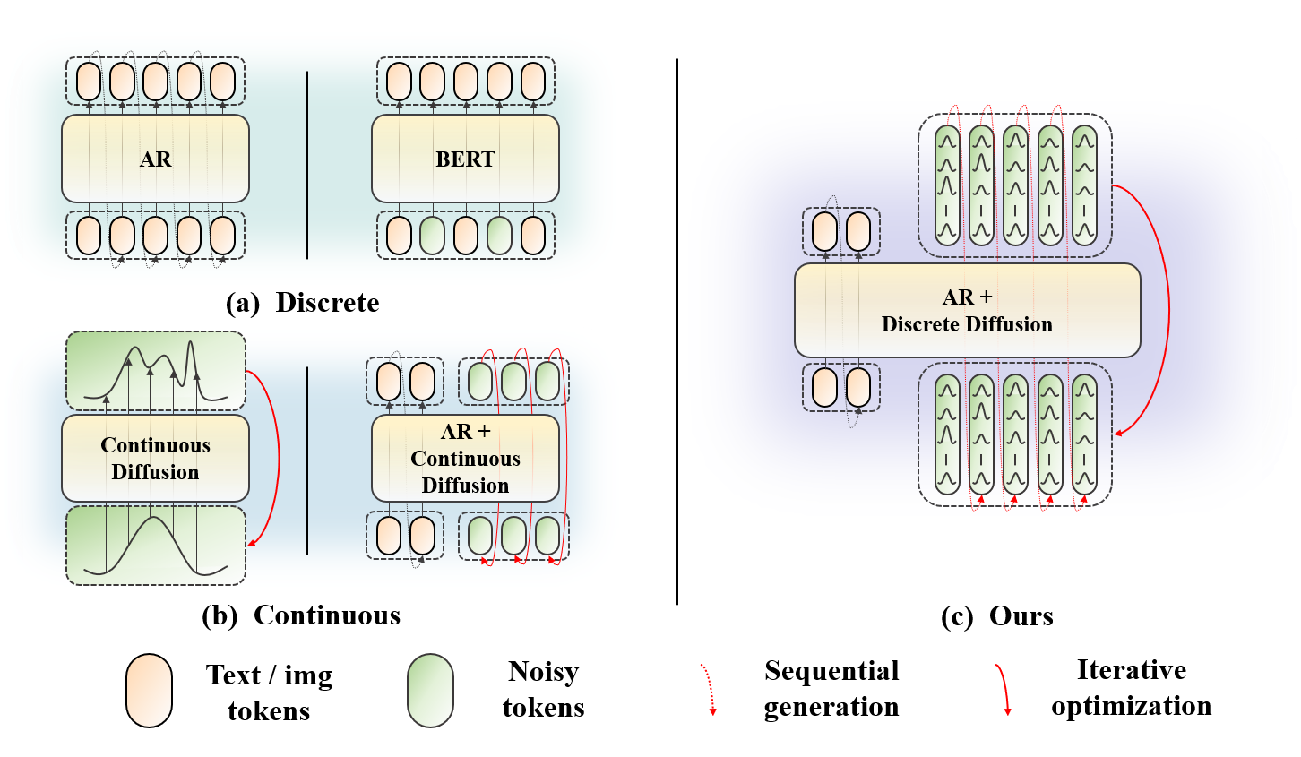 Fig.2 Overview of action modeling paradigms. (a) Discrete modeling: Traditional autoregressive (AR) approaches and recent mask-based discrete diffusion methods, which operate over a small discrete action vocabulary. (b) Continuous modeling: Continuous diffusion–based policies and AR–diffusion hybrids that regress continuous actions. (c) Our approach: $\mathcal{E}_0$ integrates AR-style conditioning with continuized discrete diffusion, enabling efficient action generation while preserving compatibility with pretrained vision–language backbones and supporting fine-grained action control.