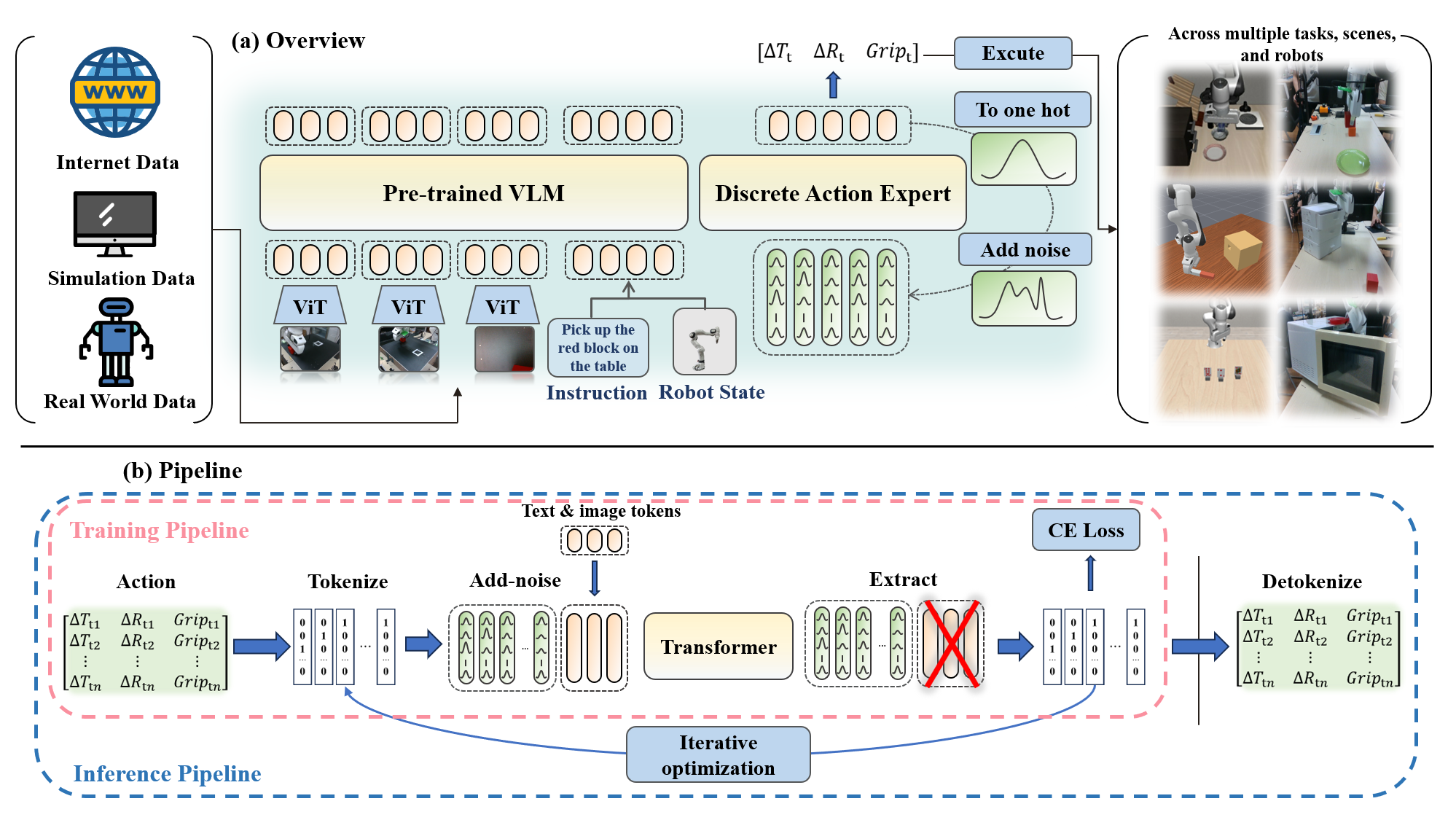 Fig.1 Overview and detailed illustration of $\mathcal{E}_0$. (a) Overall architecture of the proposed model. (b) Training and inference pipeline, showing how inputs are encoded, diffused, and decoded into executable action sequences.