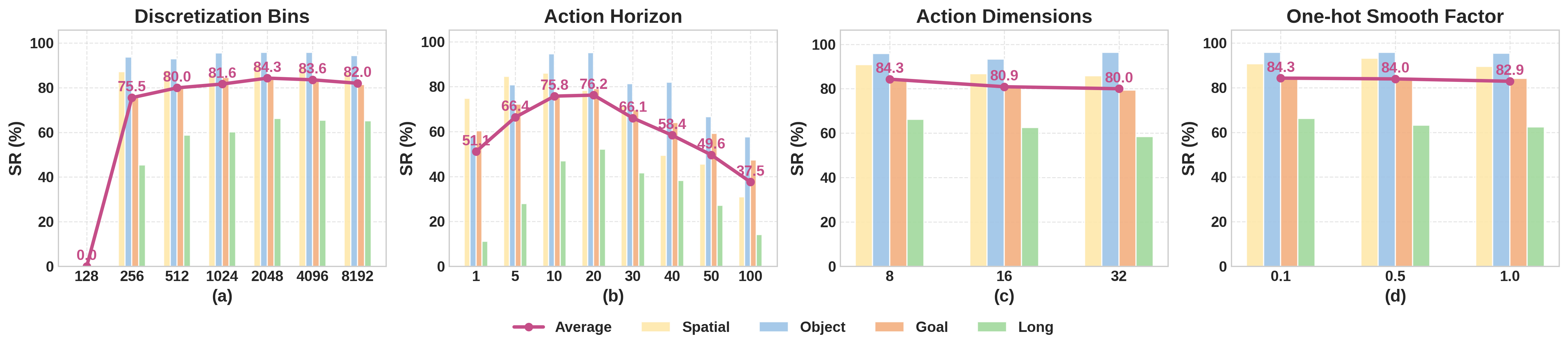 Fig.3 Comprehensive ablation analysis of key hyperparameters in the LIBERO environments. We investigate four crucial design factors influencing our model: (a) Discretization bins—increasing bin granularity enhances precision up to 2048 bins, beyond which gains saturate; (b) Action horizon—a moderate prediction length balances reactivity and temporal consistency; (c) Action dimensions—embedding sizes slightly above the dataset’s action space yield the best expressiveness–robustness trade-off; and (d) One-hot smooth factor—moderate decay values smooth discrete logits, stabilizing diffusion and improving overall success rate.